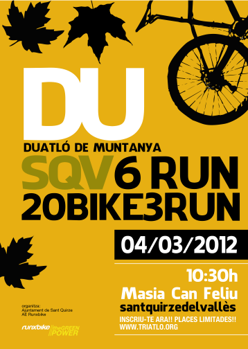 Molt a prop nostre i per camins ben coneguts,com la part del Camí dels Monjos per Sant Quirze seran l escenari d aquest primer duatló de Sant Quirze,que de ben segur comptarà amb una bona part dels membres de la secció triatlera. http://www.runxbike.com/